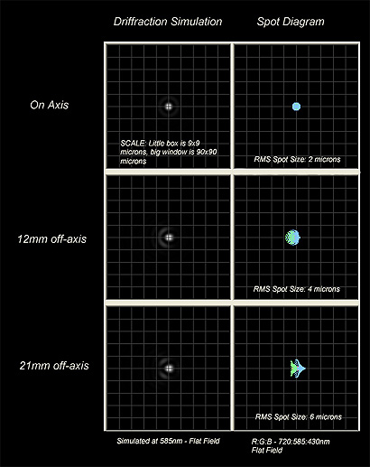 Performanta optica Pentru fiecare model puteti descarca brosura cu specificatiile tehnice si performantele optice. Mai jos va prezentam doua simulari ale performantei optice a telescopului CDK 20. Prima este o simulare a difractiei, iar a doua o diagrama spot. In ambele simulari patratele au dimensiunea de 9 microni, marimea unui pixel al multor camere cu chipuri ccd utilizate in astrofotografie. In simularea difractiei imaginile stelelor pe axa optica si off-axis sunt aproape identice. In diagrama spot, la 21mm de axa optica marimea spotului are un diametrul incredibil de doar 6 microni RMS. Acest lucru inseamna ca stelele pe un cerc cu un diametru de 42mm in planul focal vor fi puncte de lumina, marimea acestora fiind limitata doar de atmosfera. Ambele simulari iau in considerare un camp plat, ceea ce este o reprentare mai adecvata a cum se va comporta optica cu un chip ccd. Pentru observatii vizuale este permisa o anumita curbura a campului, intrucat ochiul uman poate compensa campul curbat. Simularea difractiei a fost calculata la 585nm. Diagrama spot a fost calculata la 720, 585 si 430nm. Multi alti producatori prezinta diagrama spot calculata numai pe o lungime de unda, dar aberatia cromatica nu se poate vedea cu doar o singura lungime de unda.